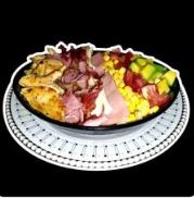 Pollo, costilla, papas a la francesa, monedas de patacón, lechuga, más tomate.