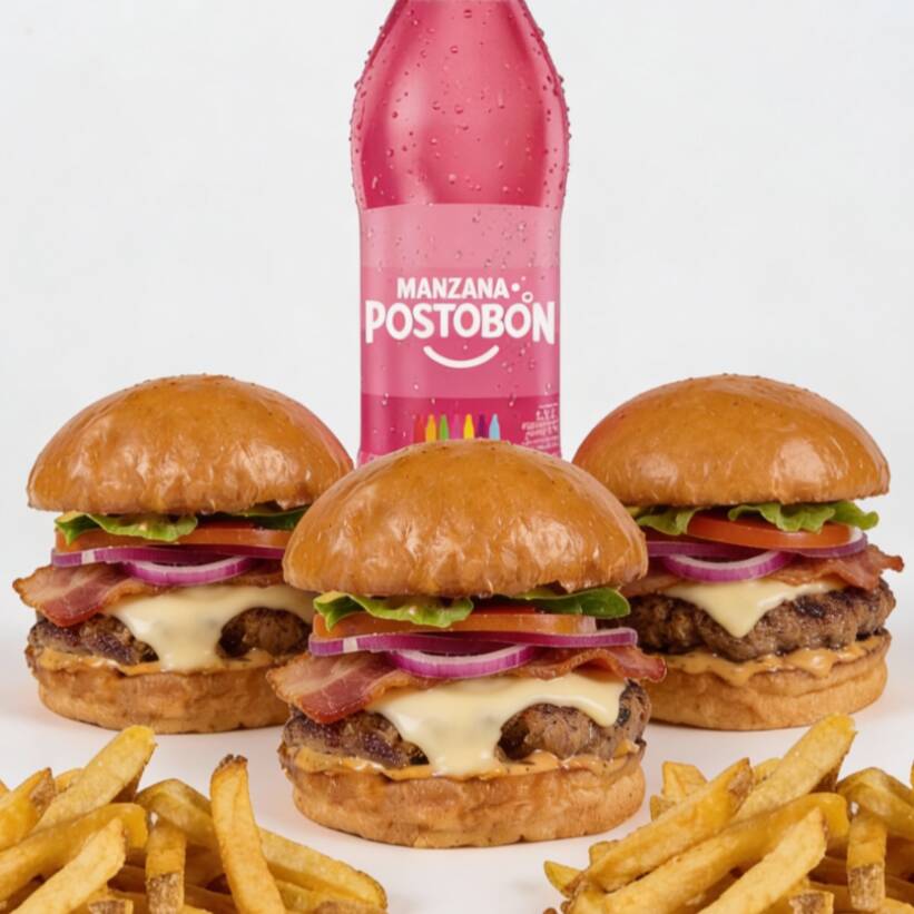 3 hamburguesas 200 gr carne angus, queso mozzarella, tocineta, cebolla, tomate, lechuga, salsa de la casa, 2 porciones de papas personales y gaseosa postobon 1.5 L. (Sabor sujeto a disponibilidad de la tienda)