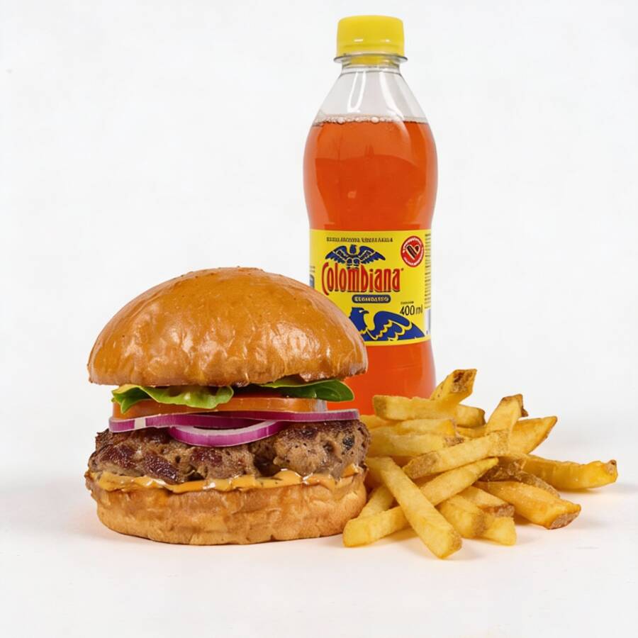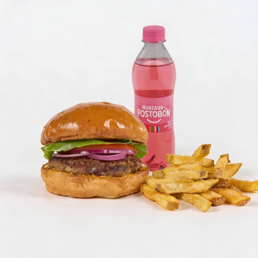 Hamburguesa de 200 gr de carne angus, queso americano, tocineta, cebolla, tomate, lechuga, salsa de la casa, papas a la francesa y gaseosa Postobón 400 ml. (Sabor sujeto a disponibilidad de la tienda)