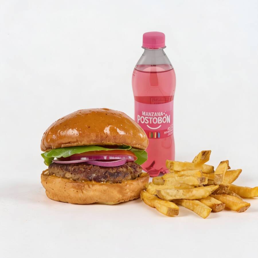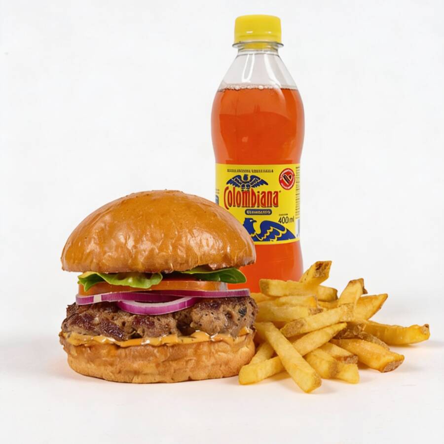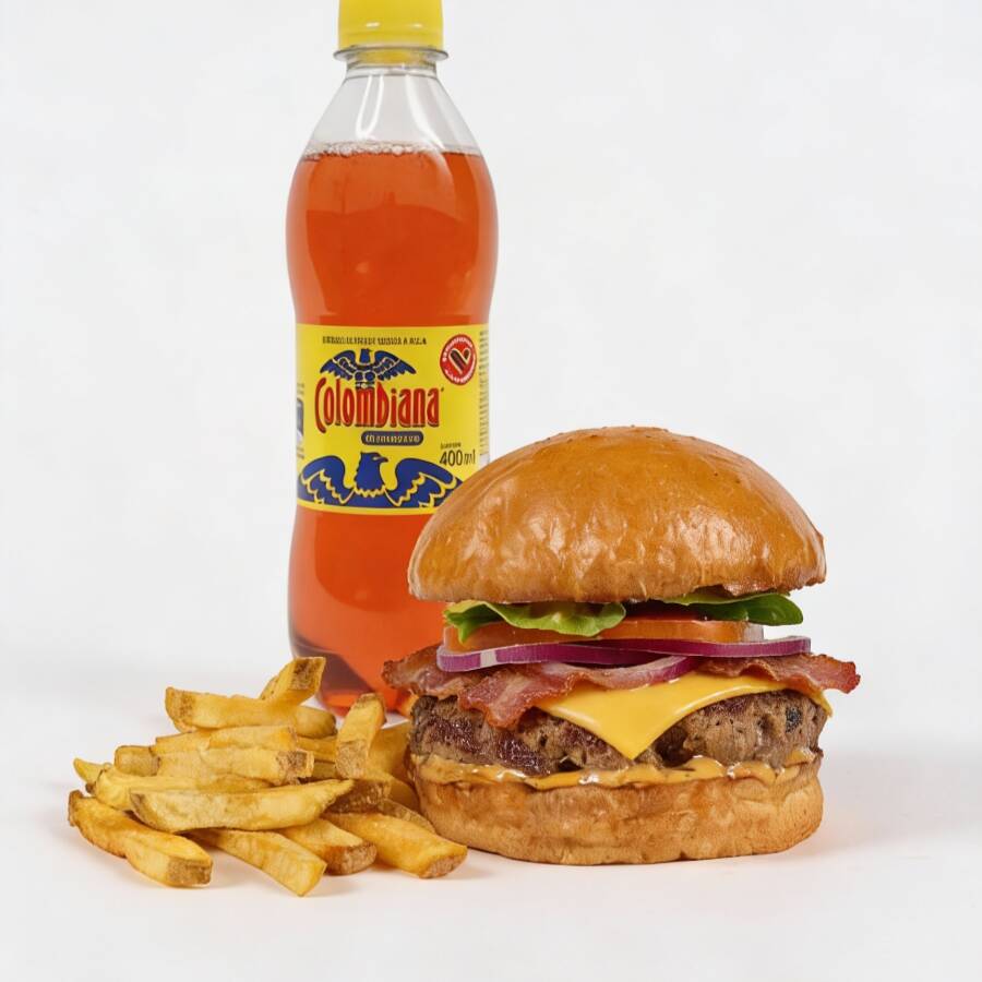 Hamburguesa de 200 gr de carne angus, queso americano, tocineta, cebolla, tomate, lechuga, salsa de la casa, papas a la francesa y gaseosa Postobón 400 ml. (Sabor sujeto a disponibilidad de la tienda)