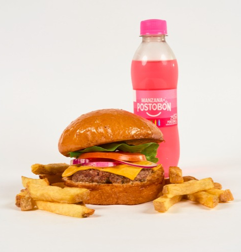 Hamburguesa de 200 gr de carne angus, queso americano, tocineta, cebolla, tomate, lechuga, salsa de la casa, papas a la francesa y gaseosa Postobón 400 ml. (Sabor sujeto a disponibilidad de la tienda)