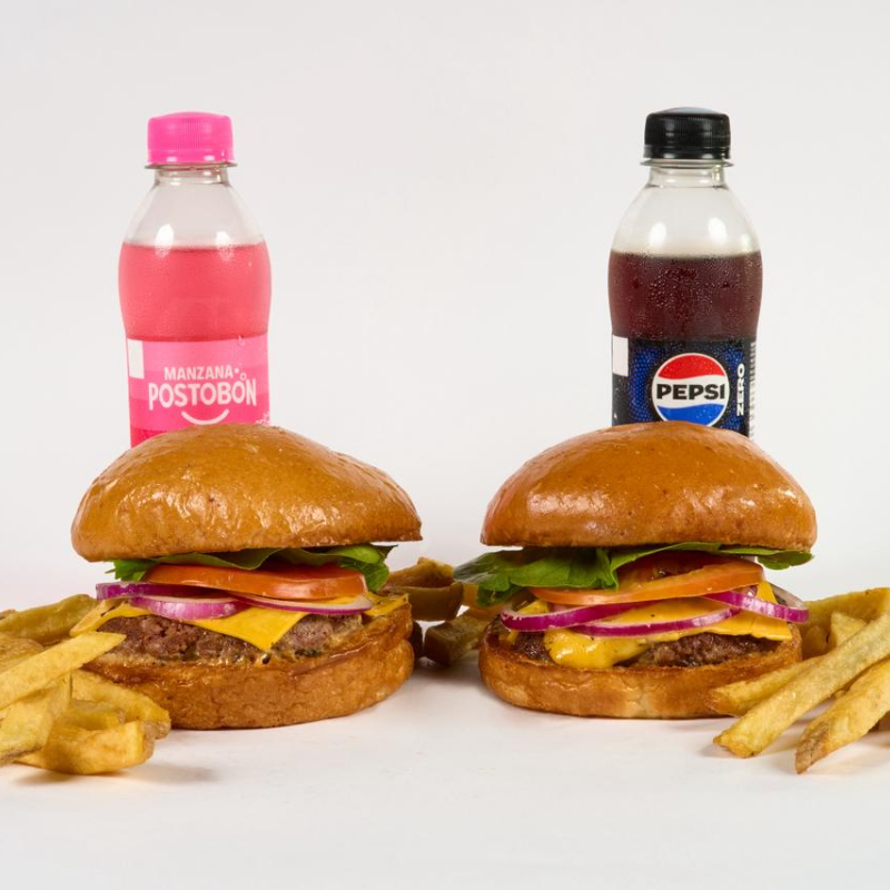 2 Hamburguesas con carne 1/4 de libra, queso americano, cebolla, tomate, lechuga y salsa de la casa, con 2 Gaseosas Postobon de 250ml (Sabor sujeto a disponibilidad de la tienda)