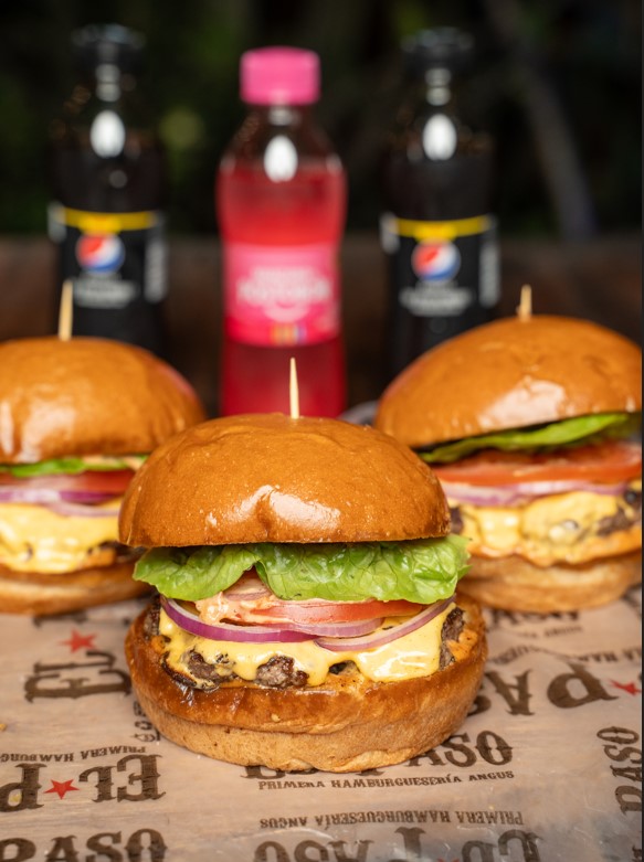 3 Hamburguesas con carne 1/4 de libra, queso americano, cebolla, tomate, lechuga y salsa de la casa, y 3 Gaseosas Postobon de 250ml (Sabor sujeto a disponibilidad de la tienda)