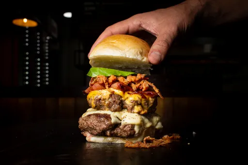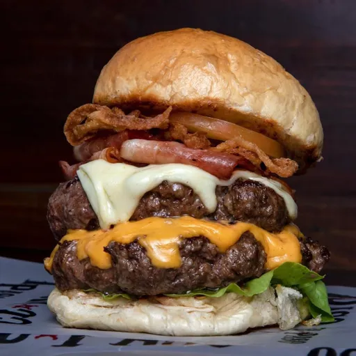 Hamburguesa de 400 gr de carne angus, término 3/4, con pan brioche, lechuga, tomate y salsa de la casa a base de pepinillos, mayonesa y mostaza. Foto incluye toppings con costo adicional