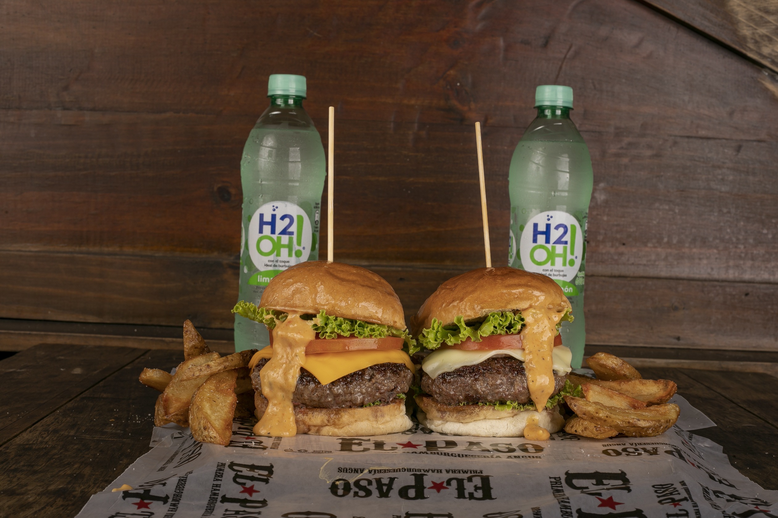 Dos hamburguesas de 200 gr de carne angus, término 3/4, con pan brioche, lechuga, tomate, salsa, papas rústicas de la casa y 2 H2OH, Lima Limón 600ml.