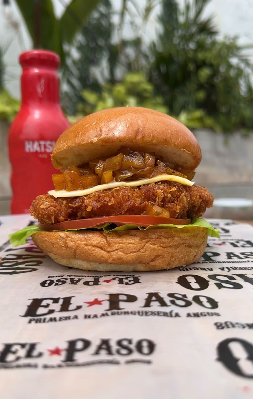 Pan de papa artesanal, pollo crocante en hojuelas de maiz, queso americano, escoge la salsa entre BBQ y miel mostaza, vegetales frescos.