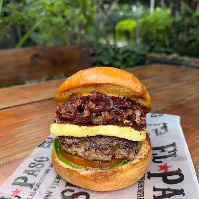 Pan de papa, carne angus, mermelada de chicharrron envinada, queso asado, lechuga y tomate.