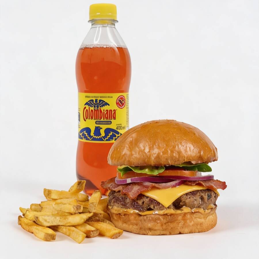 Hamburguesa de 200 gr de carne angus, queso americano, tocineta, cebolla, tomate, lechuga, salsa de la casa, papas a la francesa y gaseosa Postobón 400 ml. (Sabor sujeto a disponibilidad de la tienda)