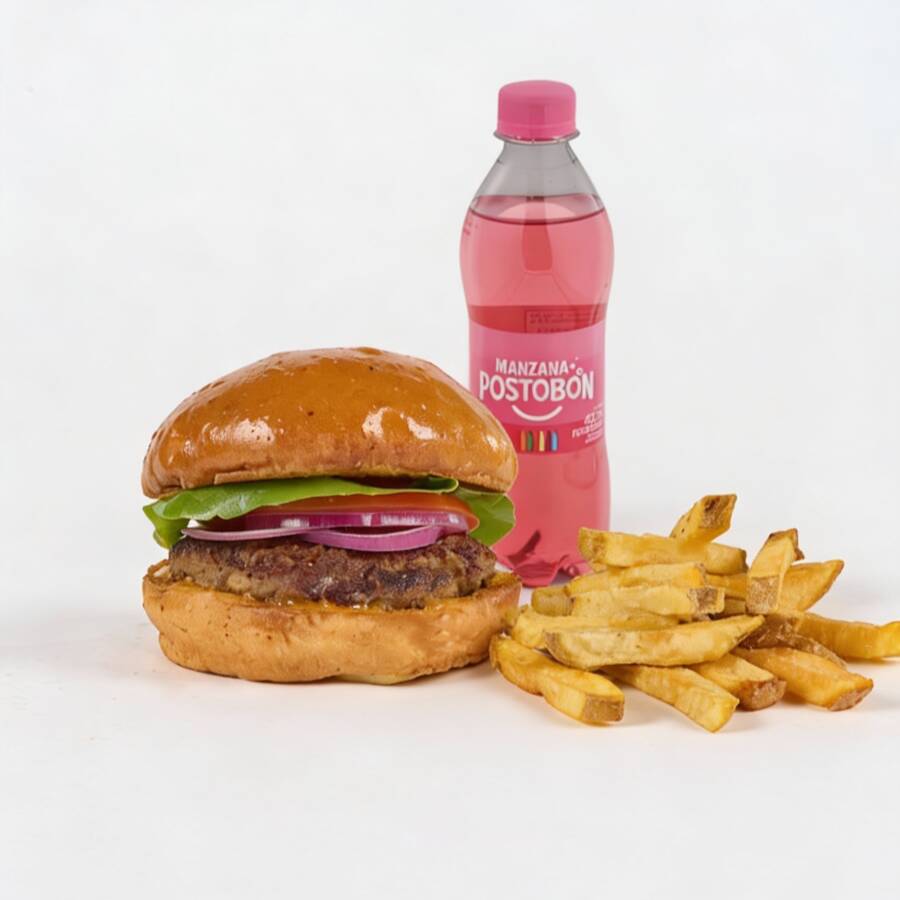 Hamburguesa de 125 gr de carne angus, cebolla, tomate, lechuga y salsa de la casa, papas a la francesa y gaseosa Postobón 400 ml. (Sabor sujeto a disponibilidad de la tienda)