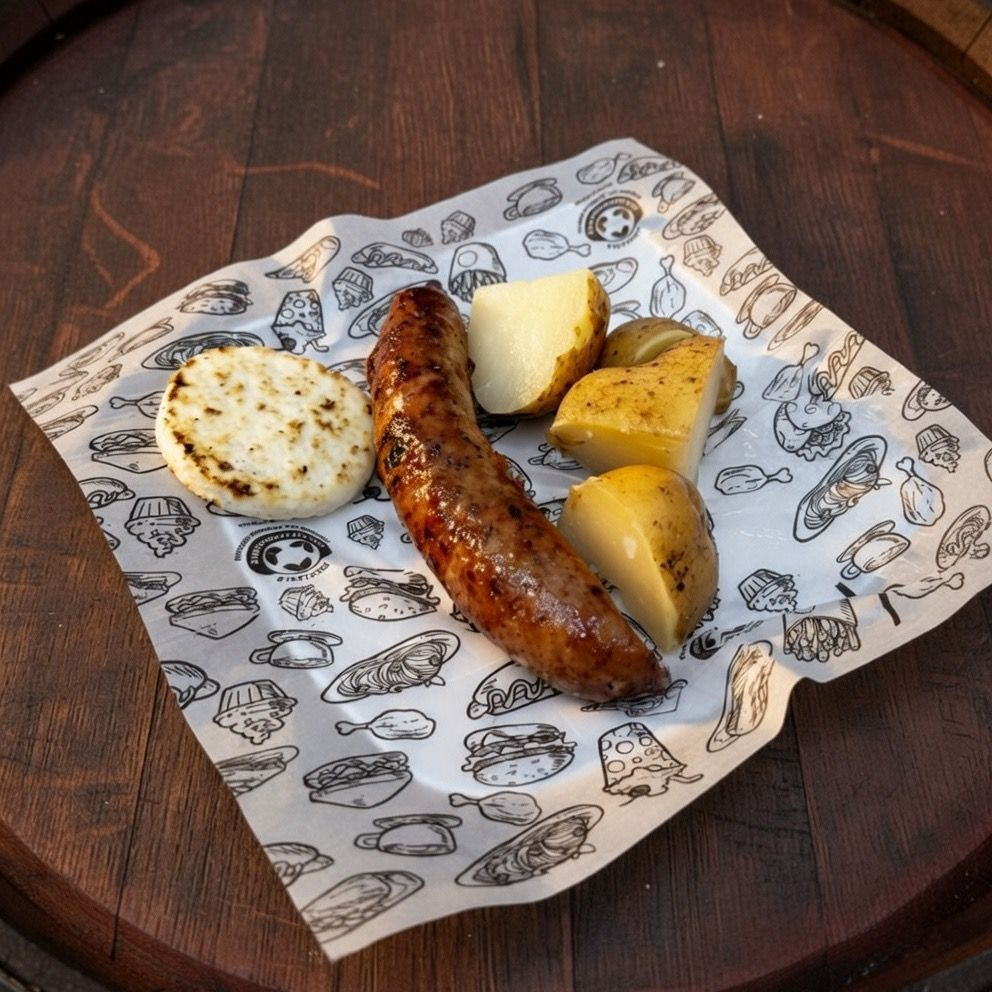Delicioso chorizo acompañado con papa cocida y arepa.