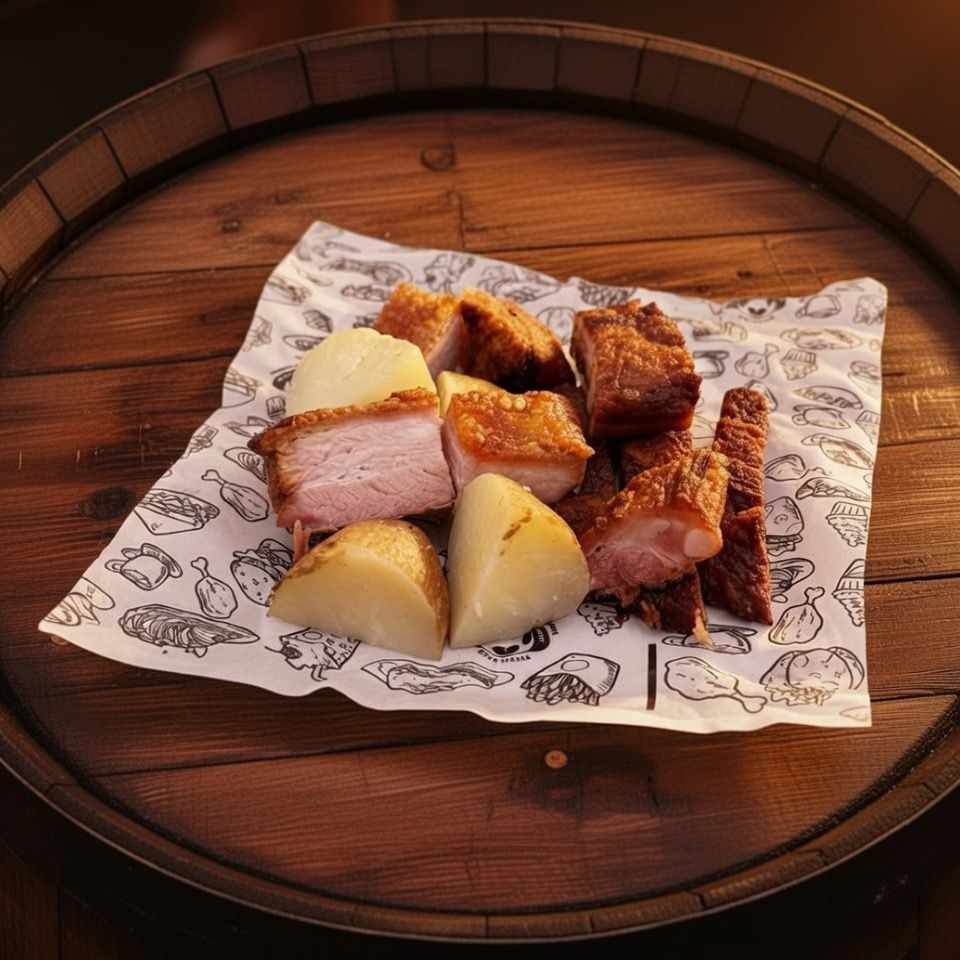 Picada personal con chicharrón y costilla de búfalo, papa cocida y arepa.