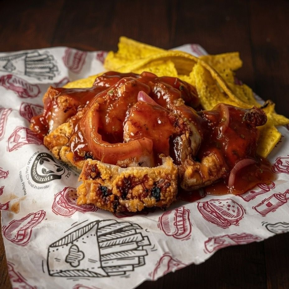 Deliciosa porción personal de chicharrón con salsa de ceviche y tostones de plátano.