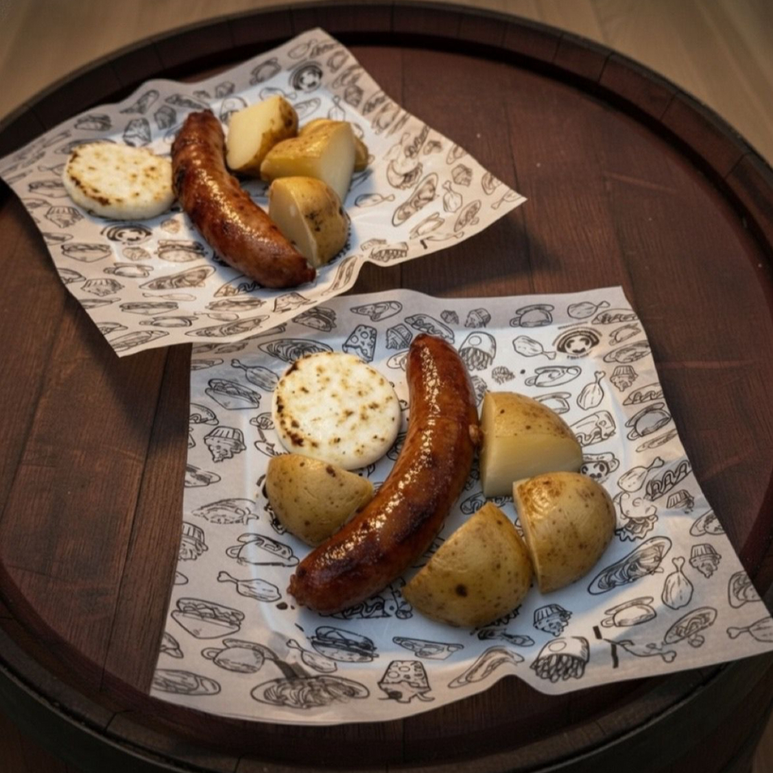 2 Deliciosos chorizos acompañados de papa cocida y arepa.