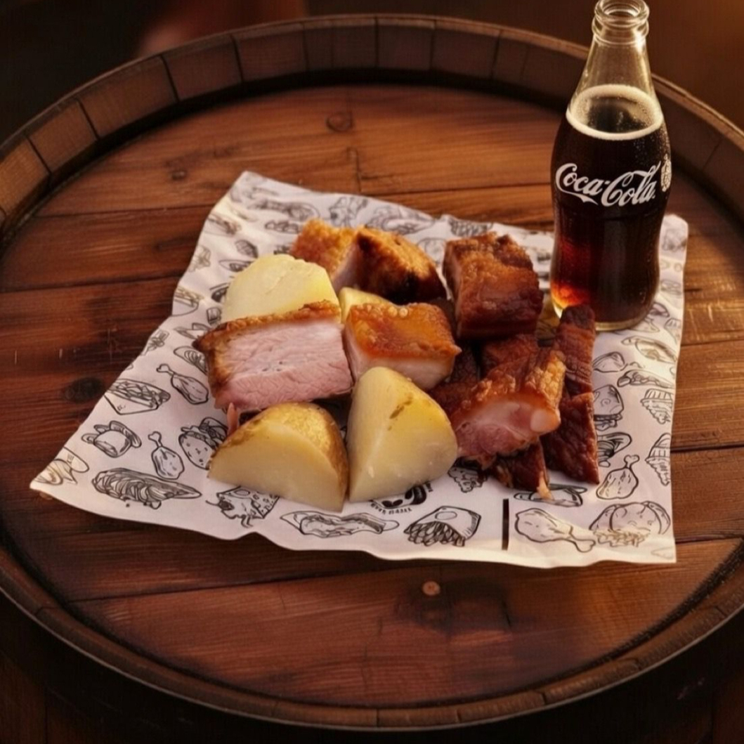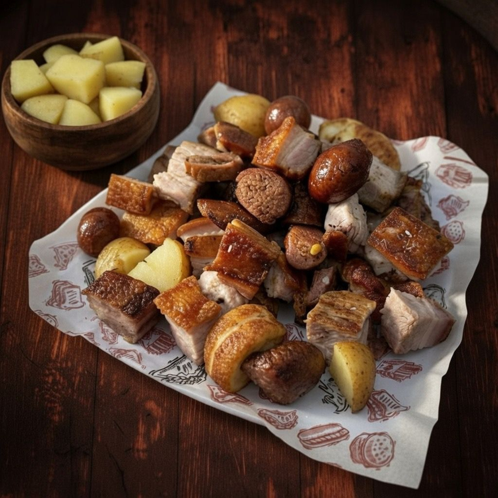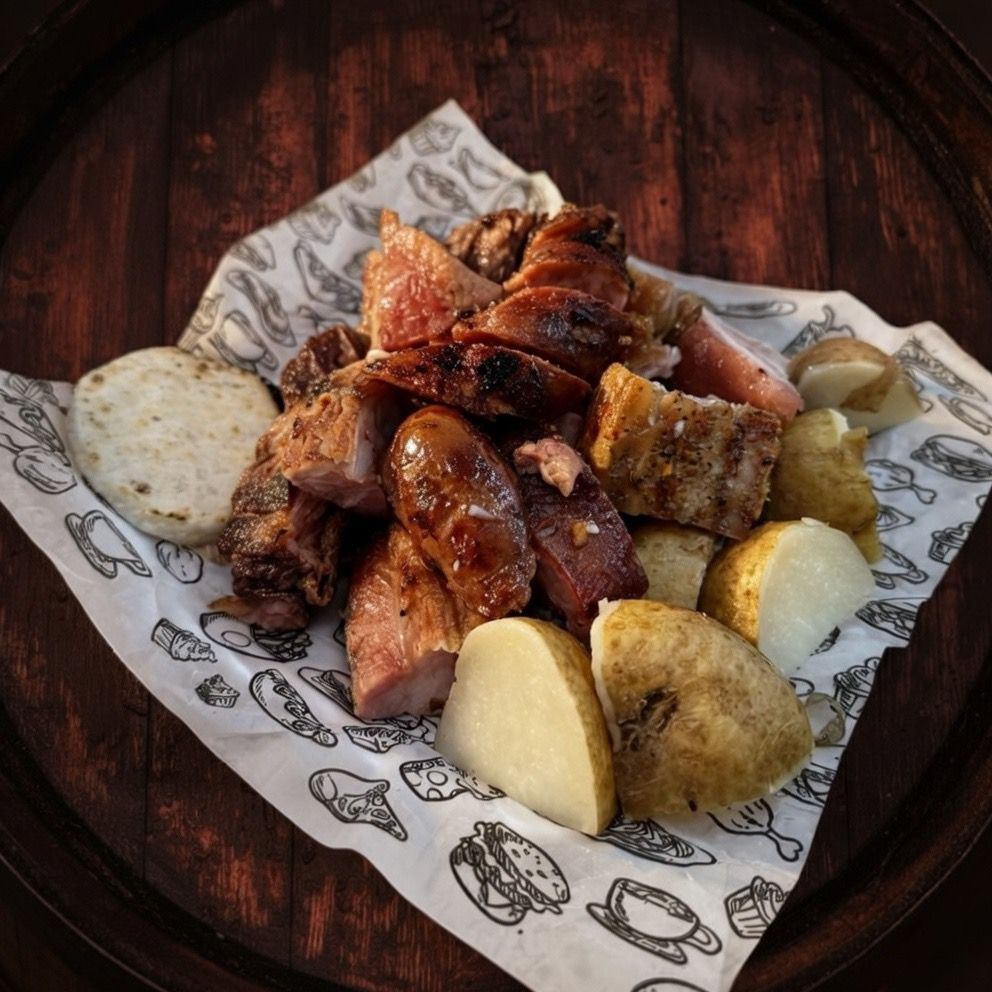 Picada para 3 o 4 personas con chicharrón, bondiola, costilla de búfalo, chorizo, papa cocida y arepa.