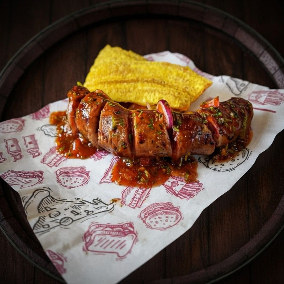 1 Unidad de chorizo con salsa de ceviche y tostones de plátano.