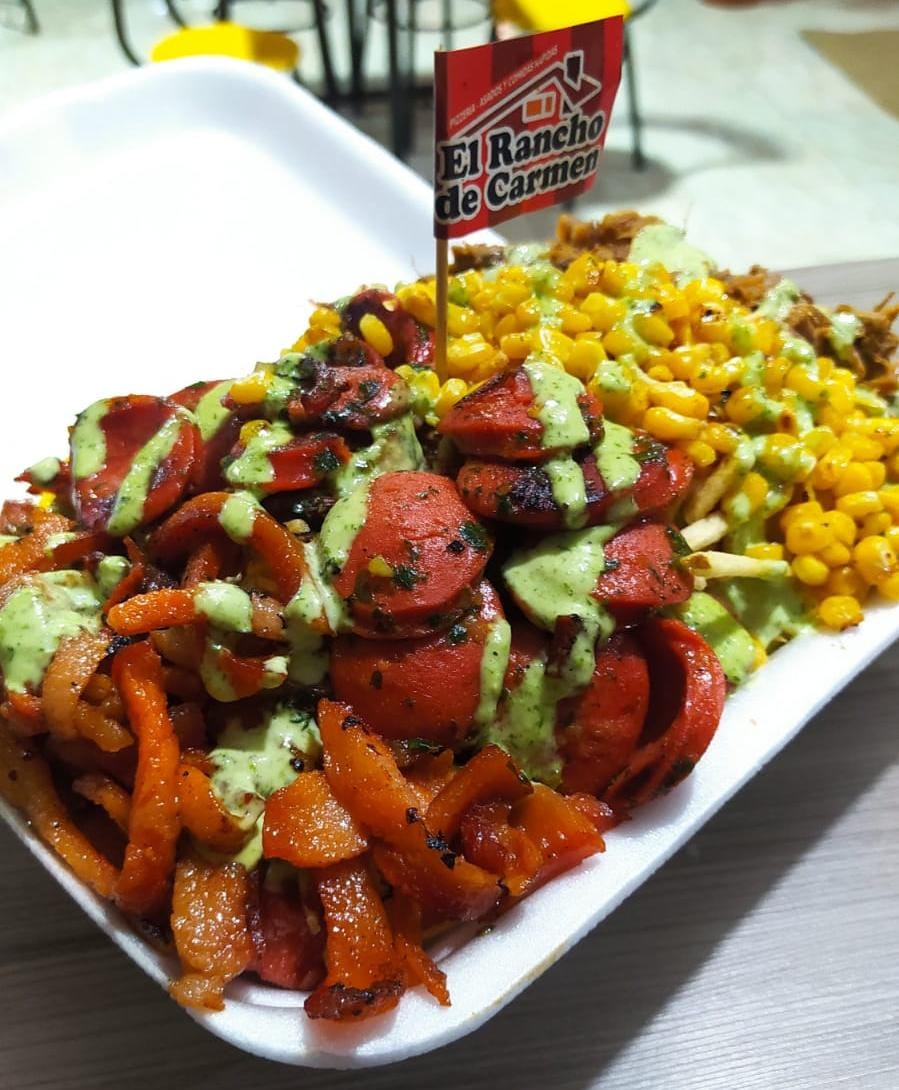 Salchipapa, Papa Frita, Queso Mozzarella, Ripio De Papa, Maiz Tierno, Pollo Desmechado, Tocineta Ahumada, Costilla Ahumada, Chorizo De Res Ahumado, Carne De Hamburguesa y salsas de la casa