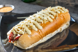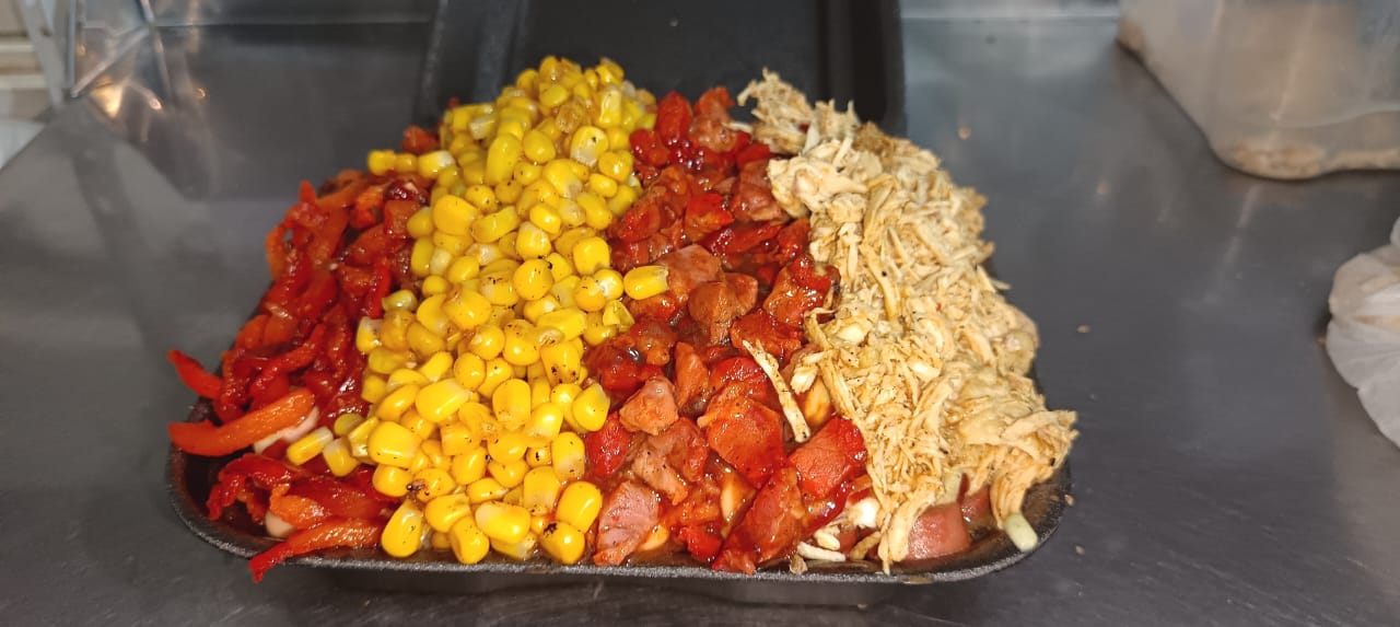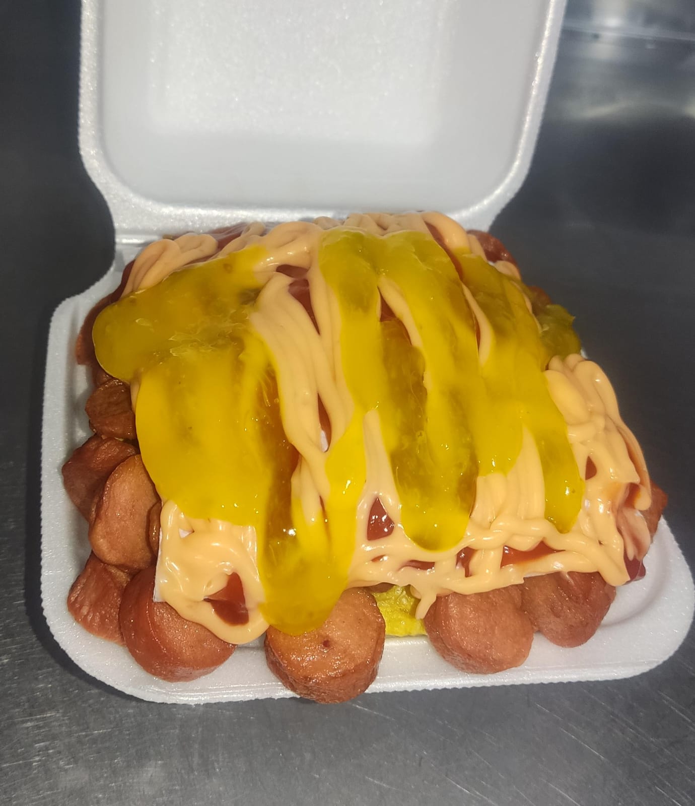 Salchicha, pollo desmechado, maíz tierno, Papa Frita, triple Queso Mozzarella y Salsas Al Gusto.