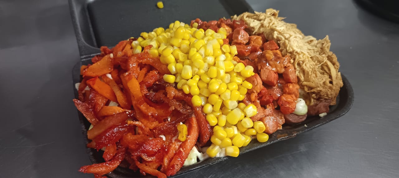Salchicha, Papa Frita, Cuatro Queso Mozzarella, Ripio de Papa, Pollo Desmechado, Maíz Tierno, Tocineta Ahumada, Costilla Ahumada y salsas al gusto.