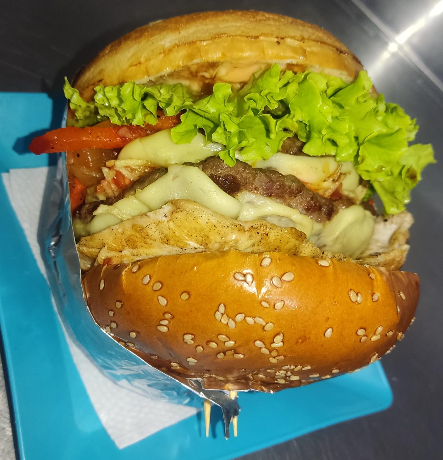 Pan Brioche, Carne De Hamburguesa Artesanal, Filete De cerdo 120 gr, Jamón, Tocineta Ahumada, Doble Queso Mozzarella, Cebolla Caramelizada, Lechuga, Tomate, Ripio y salsas.