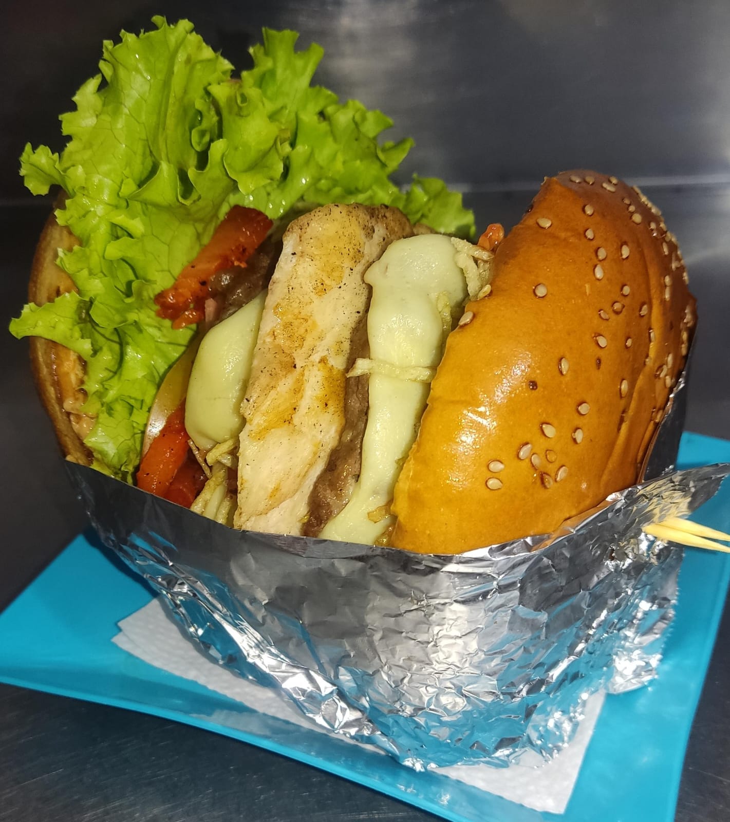 Pan Brioche, Doble Carne De Hamburguesa Artesanal, Jamón, Tocineta Ahumada, Doble Queso Mozzarella, Cebolla Caramelizada, Lechuga, Tomate, Ripio y salsas.