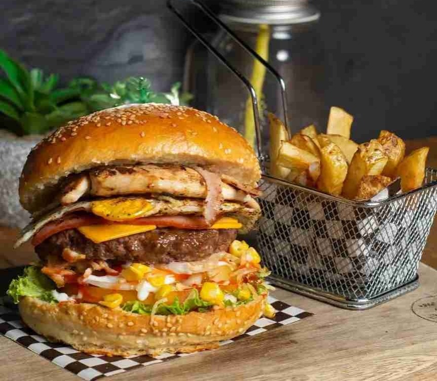 Pan, doble pollo o doble carne 100gr, doble queso mozzarella, ripio de papa, lechuga fresca, tomate, salsa de la casa (ajo), salsa rosada y salsa BBQ.