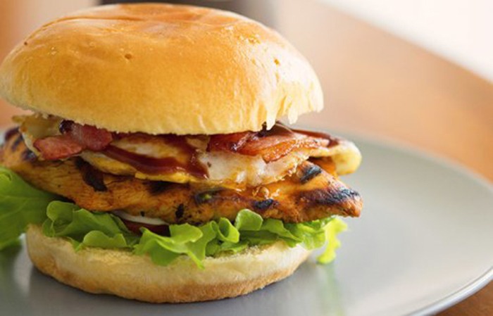 Pan, pollo sazonado a la plancha 100gr, queso mozzarella, ripio de papa, lechuga fresca, tomate, salsa de la casa, salsa rosada y salsa BBQ.