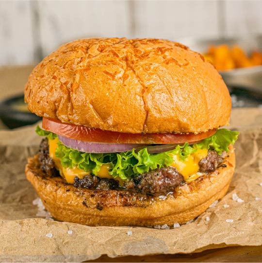 Pan premium, carne angus 100gr, queso mozzarella, ripio de papa, lechuga fresca, tomate, salsa rosada, salsa de la casa (ajo) y salsa BBQ.