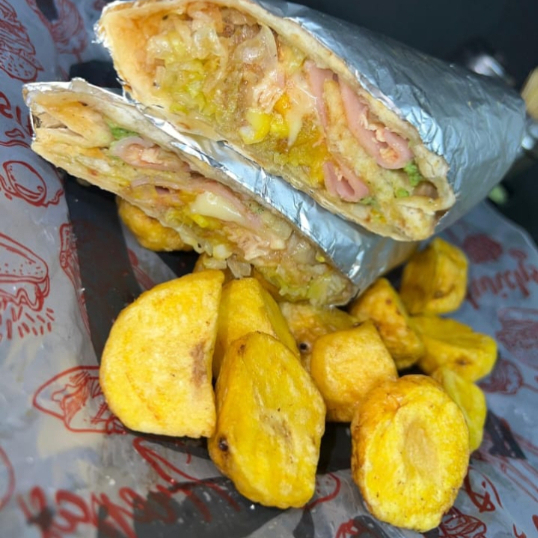 Rollito Mixto Tortilla suave rellena con trozos de carne guisada y pollo desmechado, queso fundido, lechuga fresca, jamón, maicitos dulces, maduro caramelizado, papas y nuestras salsas de la casa. ¡La mezcla ideal para los que lo quieren todo en un solo bocado!