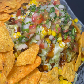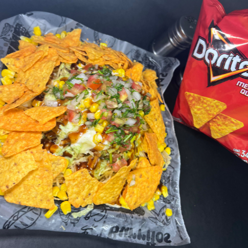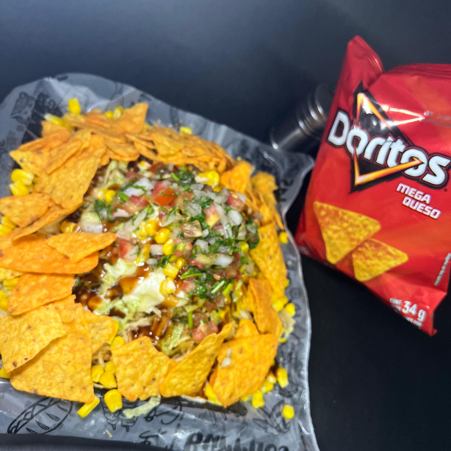 Delicioso doriloco con una cama de lechuga ripio la salsas únicas de la casa maicitos queso derretido y deliciosos Doritos carne desmechada
