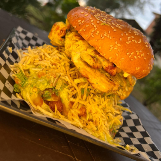 Hamburguesa Mixta Pan artesanal, carne de res jugosa y pechuga de pollo a la parrilla, queso derretido, tocineta crocante, lechuga fresca, tomate, cebolla, acompañada de papitas a un lado, ripio, pico de gallo y las irresistibles salsas de la casa.