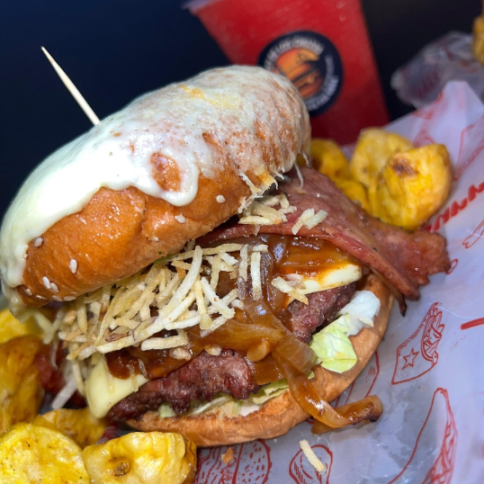 Pan, came de res 140g, tocineta, tomate, cebolla, lechuga, tomate, queso, ripio y salsas de la casa.