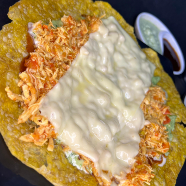 Tostada de Plátano Deliciosa tostada de plátano crocante, cubierta con pollo desmechado, queso fundido y el toque especial de nuestras salsas de la casa. ¡Un bocado diferente, lleno de sabor y tradición! 🙌