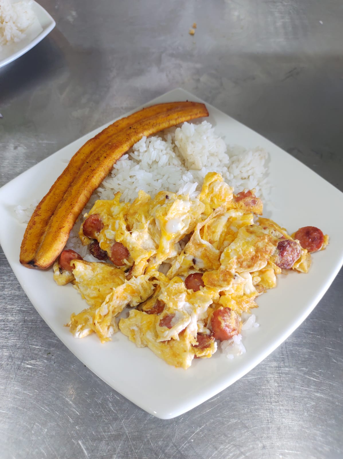 Huevos Revueltos con Salchicha Ranchera, arroz blanco, tajada madura o arepa y bebida incluida.
