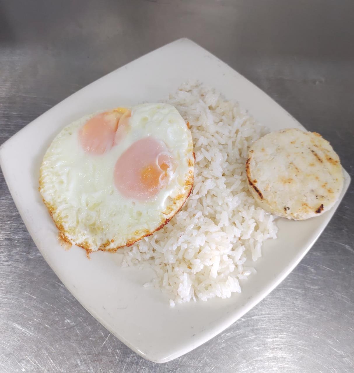 Huevos Revueltos, con una acompañamiento a tu elección + Arroz Blanco + Bebida a Elección