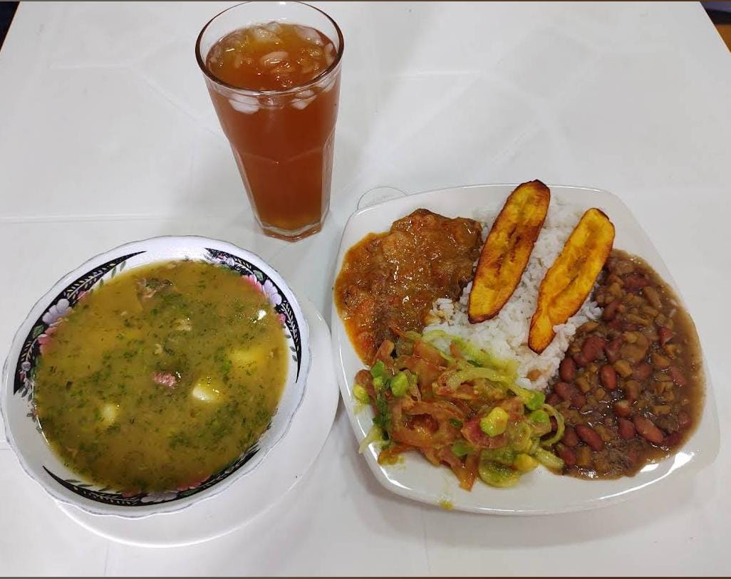 Almuerzo completo con Sopa o Crema 16 Onzas, Principio y Proteina a elección. Acompañado con Arroz, Ensalada fresca de la casa y 16 OnzasLimonada