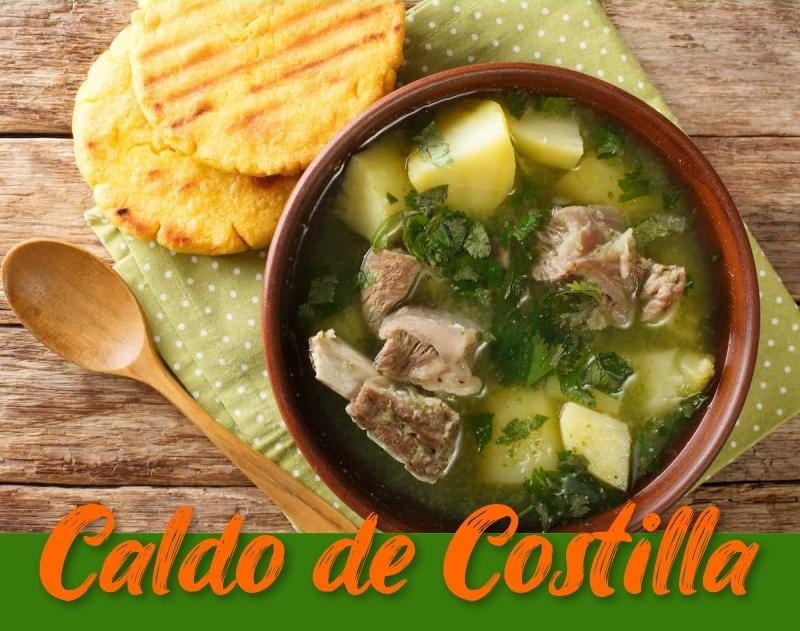 Delicioso caldo de costilla con arepa pequeña y arroz
