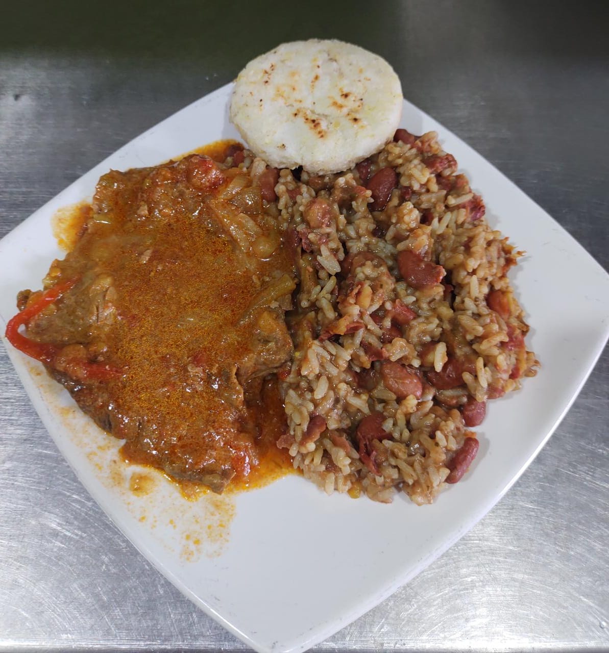 Carne desmechada, Arroz blanco, tajada o arepa y bebida a elección