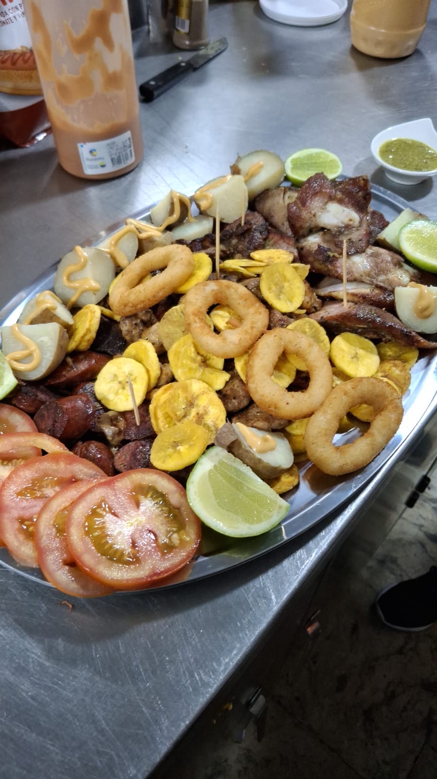 Pollo, cerdo, res, Costilla y chorizo (500g) acompañado de papa cocida, monedas de plátano, aros de cebolla y tomate.