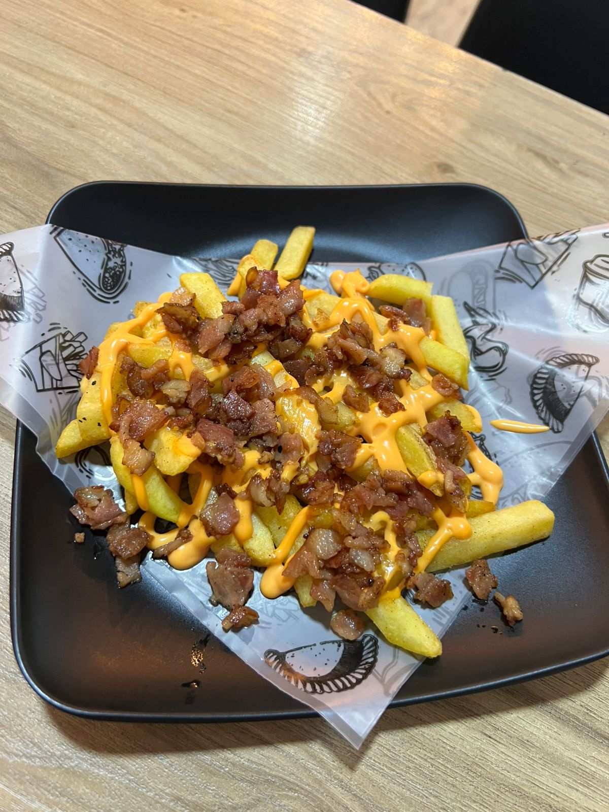 Porción de papas a la francesa, queso cheddar y tocineta