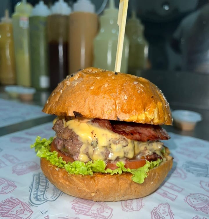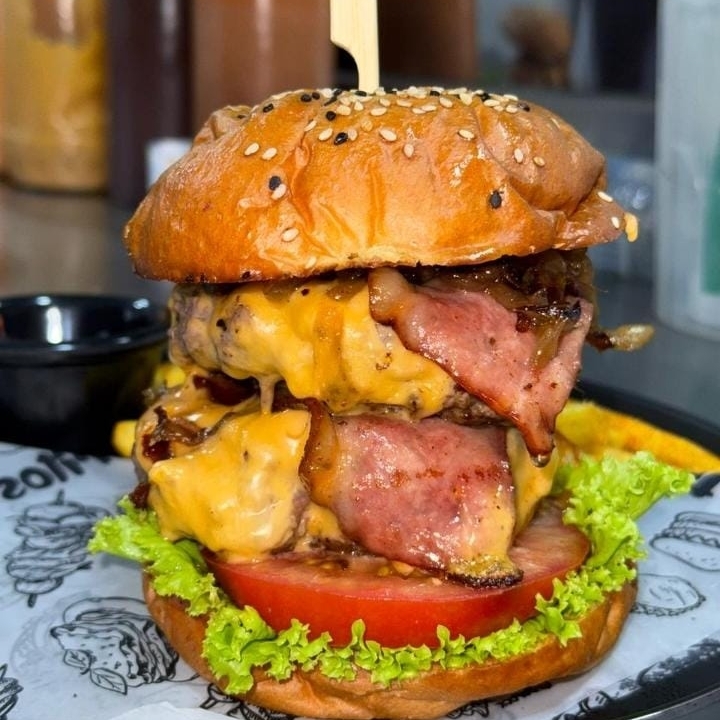 Pan brioche, vegetales frescos, 2 carnes de 180g 100% angus, 2 queso cheddar, 4 tocinetas, cebolla caramelizada y papas francesas.