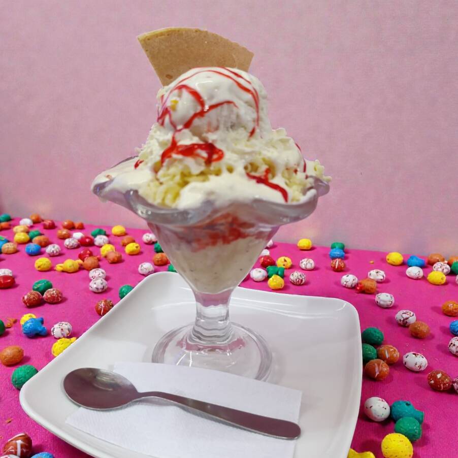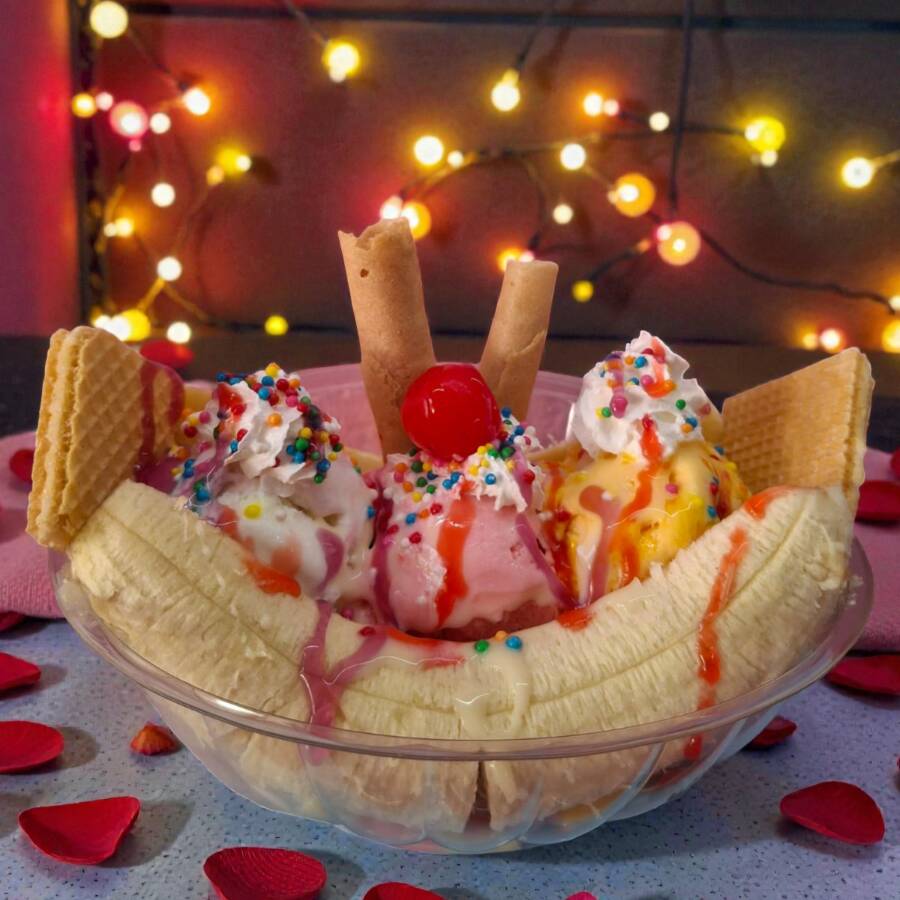 Tres bolas de helado cremoso con banano fresco, crema chantilly y nuestra irresistible salsa de la casa. un clásico que nunca falla acompañado de barquillos