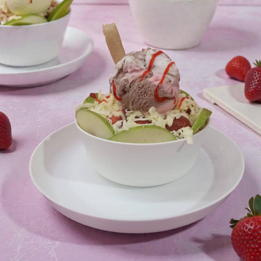 Fresa, mango, papaya, piña y manzana, acompañadas de nuestra salsa de la casa y crujientes barquillos. Fresca, colorida y deliciosa