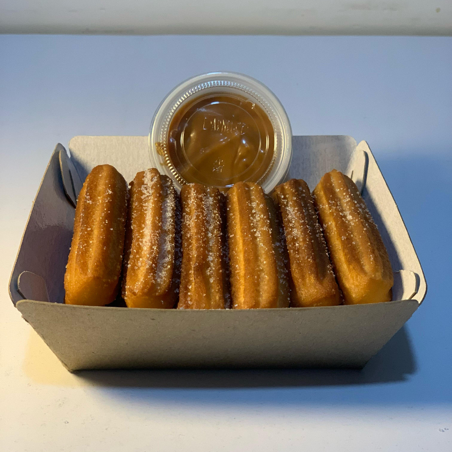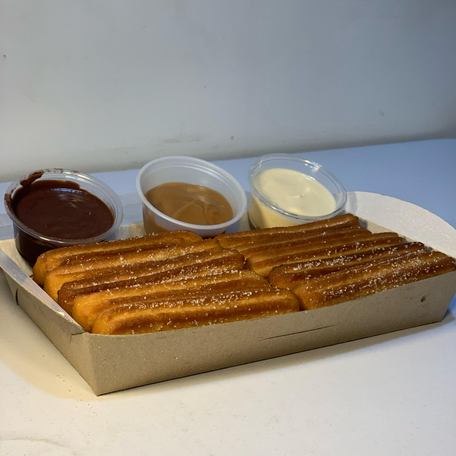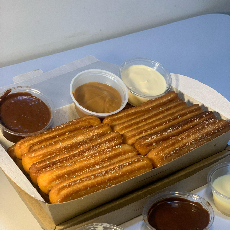12 Deliciosos churros de 10cm cubiertos con azúcar y acompañados de 1 salsa para untar.