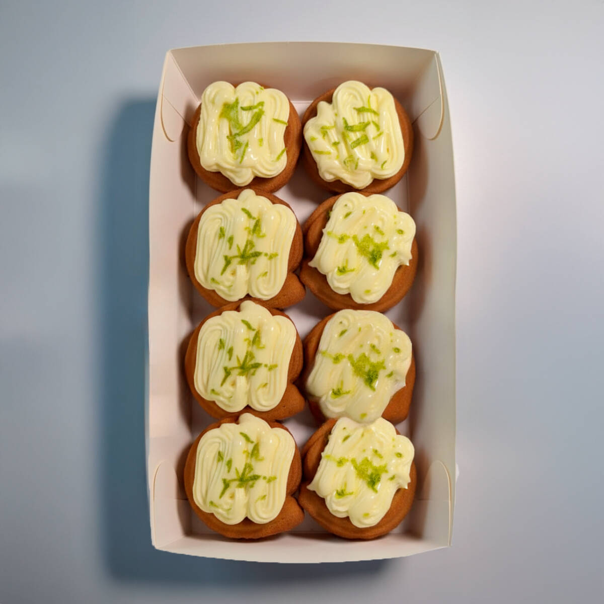 Caja de 8 churros en forma de espiral con glaseado de queso y una dulce crema de limon.