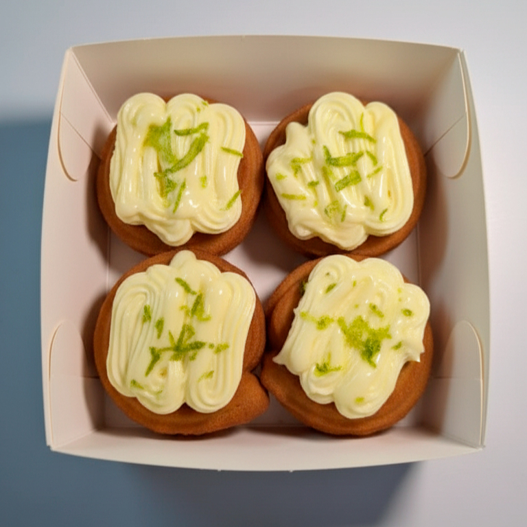 Caja de 4 churros en forma de espiral con glaseado de queso y una dulce crema de limon.