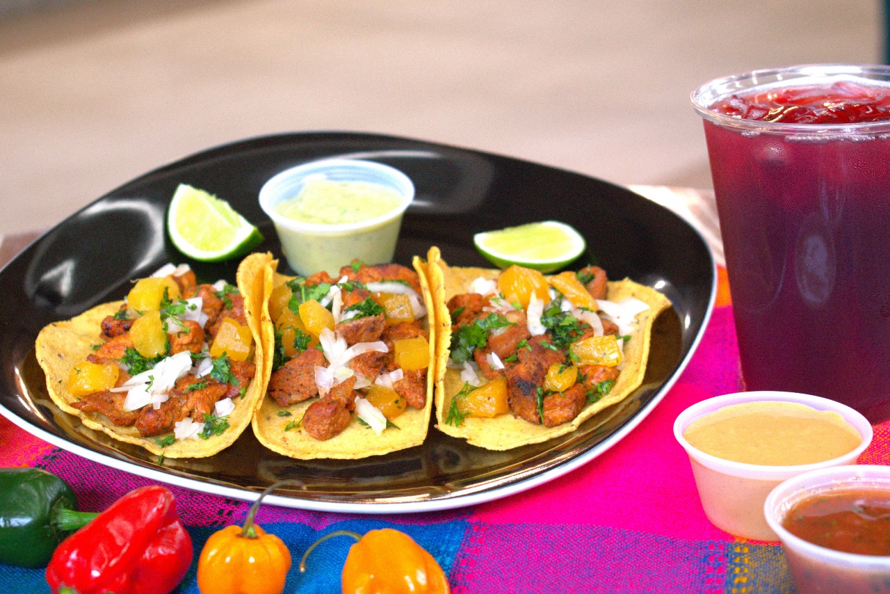 Tortilla de harina, cerdo marinado en chiles secos, achiote, frijol refrito, lechuga, pico de gallo, sour cream, guacamole, queso y piña.