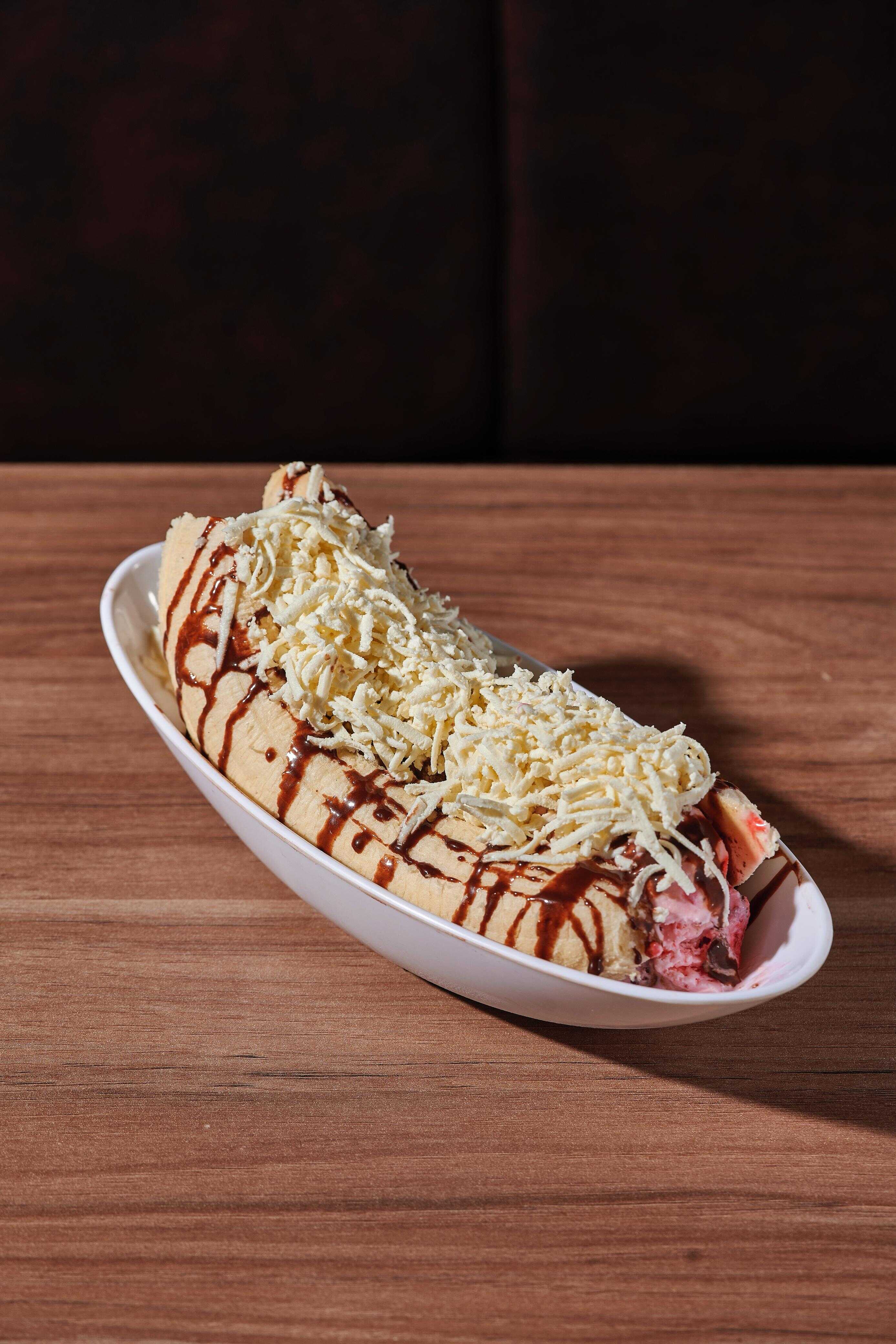 3 bolas de helado calidad Popsy, banano, salsa de chocolate y queso. Pesa 270 gramos aproximadamente.