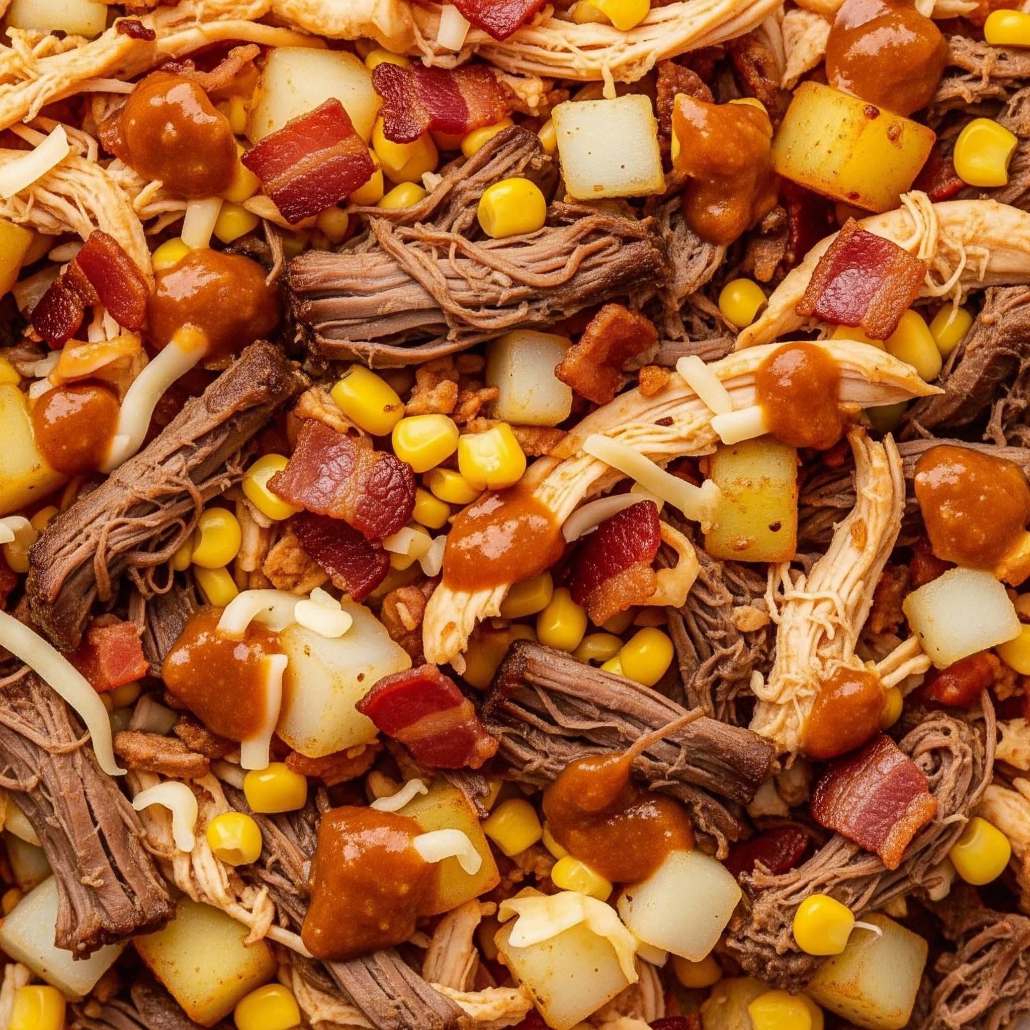 Carne desmechada, pollo desmechado, tocineta, maíz, queso, papa, salsa de la casa.