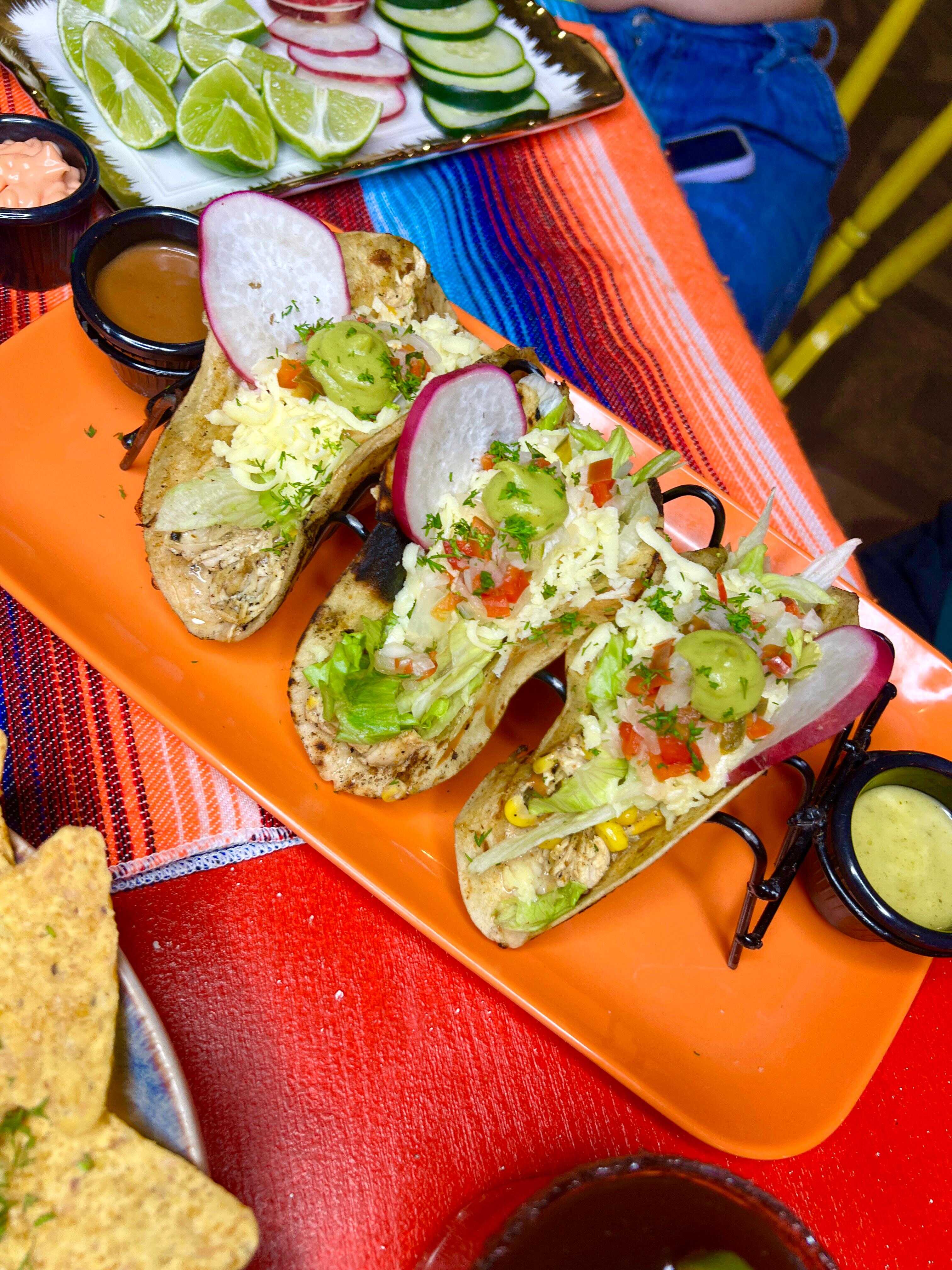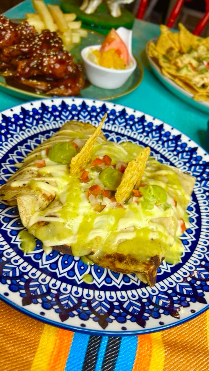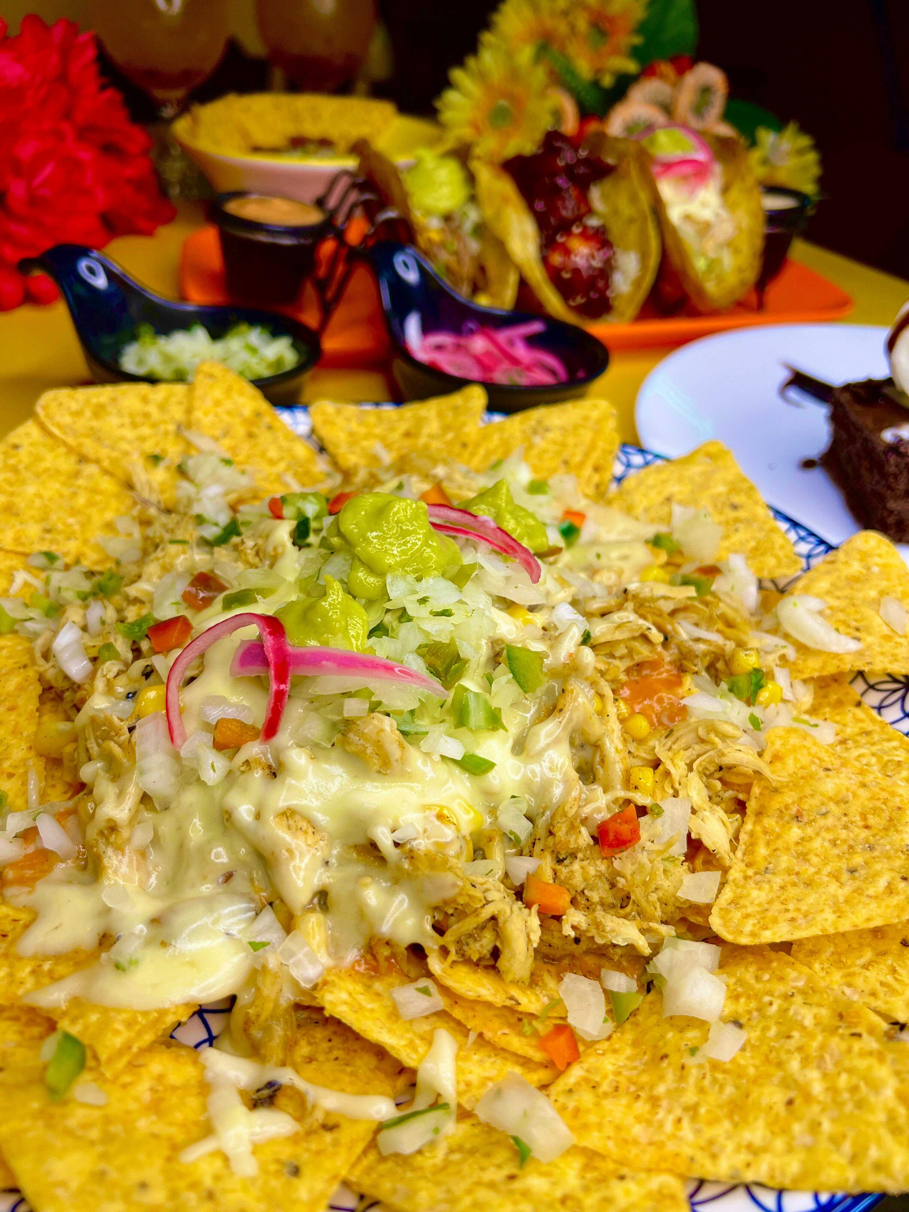 Doritos en salsa de la casa, acompañado de chinchulines dorados, maíz, pico de gallo, queso, salsa de chile dulce.