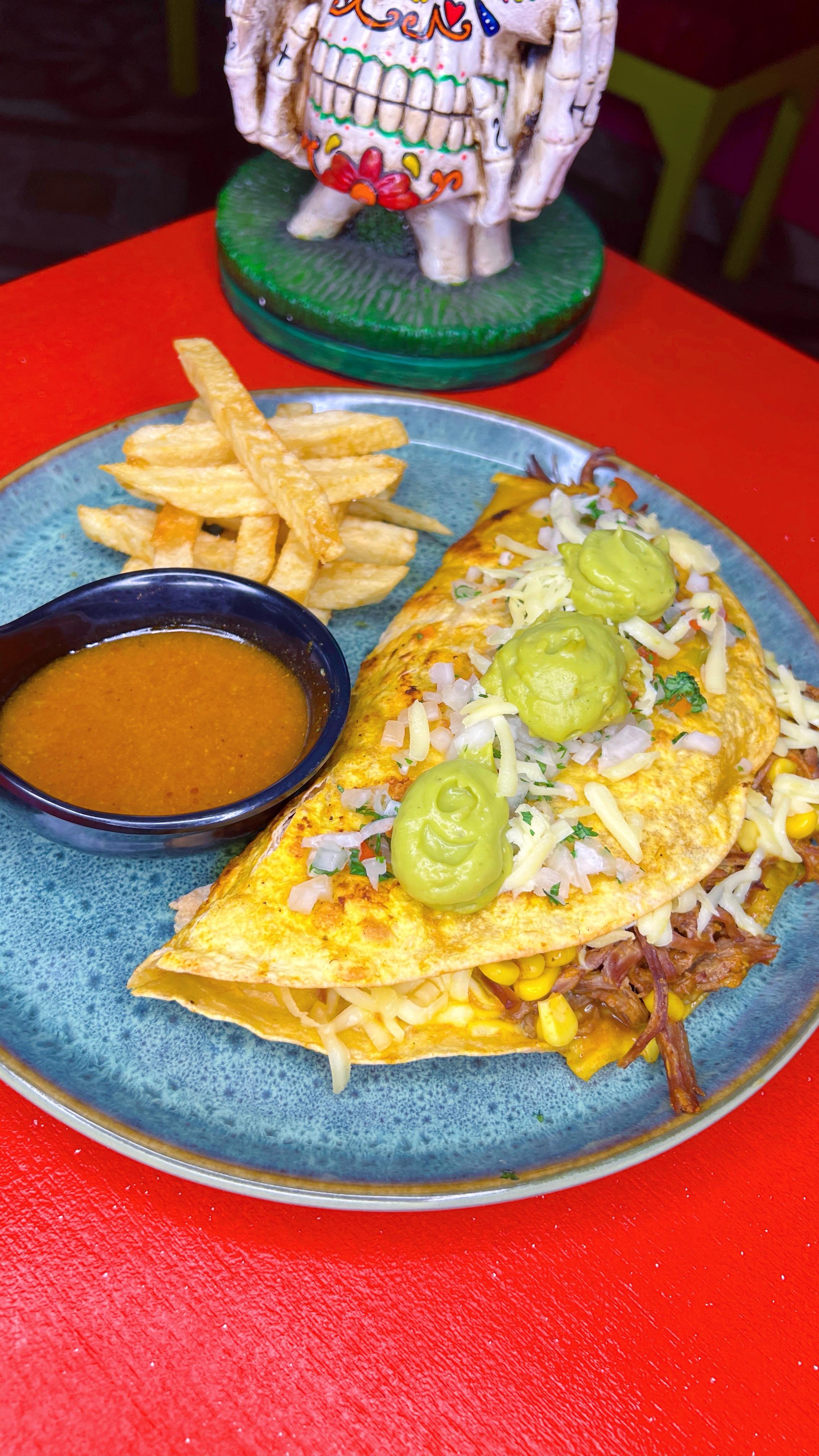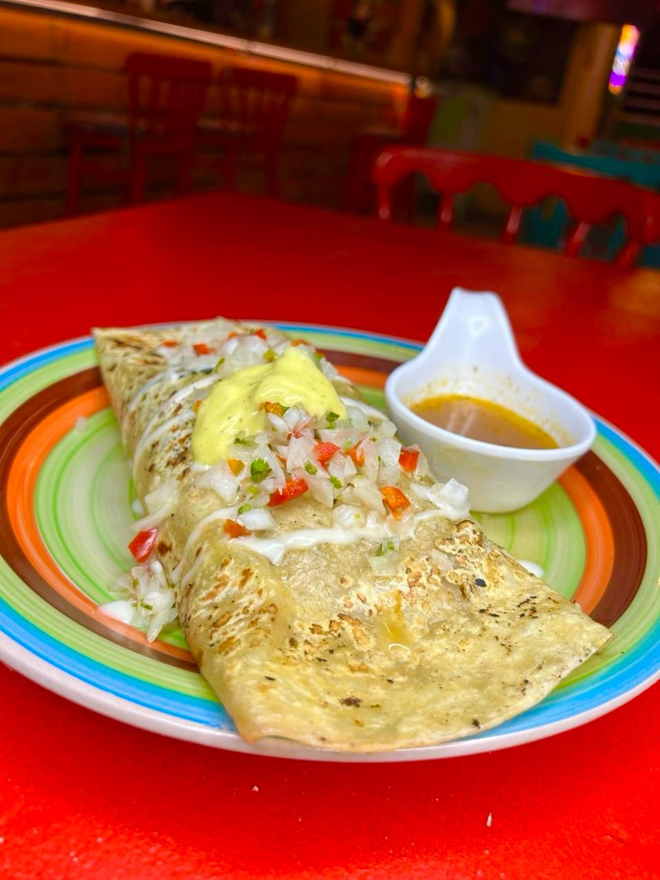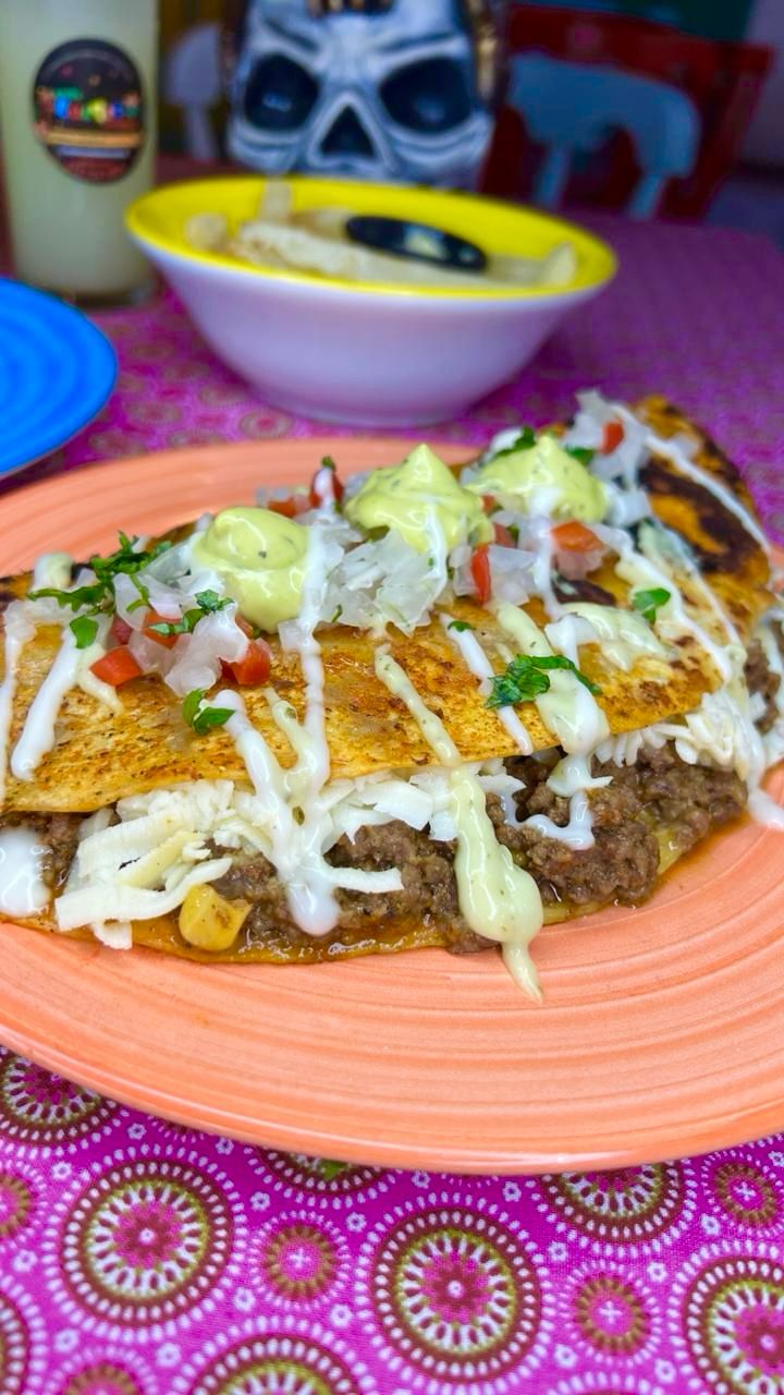 Quesadillas de Birria: Tortilla de maíz rellena de birria, pico de gallo, queso, cilantro, acompañada de gaseosa 400ml